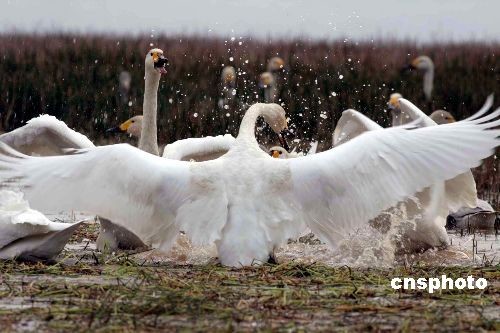 2008年11月15日,數(shù)千只大天鵝陸續(xù)飛抵江西九江縣東湖棲息覓食。由于鄱陽湖水位上漲,以及當(dāng)?shù)丨h(huán)境適宜等原因,大量國家二級保護(hù)動(dòng)物天鵝前來越冬。中新社發(fā) 張 俊 攝
