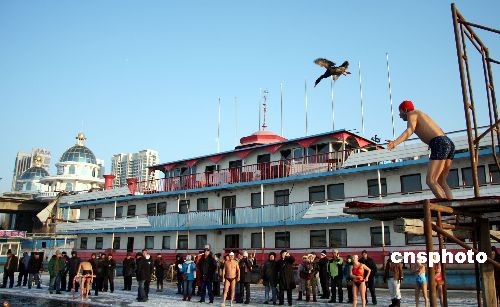 12月10日,在松花江上,黑龍江省冬泳協(xié)會(huì)新開設(shè)的冬泳池內(nèi),游客正在觀看人鴨共舞的跳水表演。游人掌聲不斷。據(jù)悉,今年入冬以來鴨子天天在冬泳池內(nèi)戲水游泳,冬泳人讓鴨子跳水是為了鍛煉它的飛行能力,也希望能成為冬泳的又一新看點(diǎn)。中新社發(fā) 姚庭山 攝