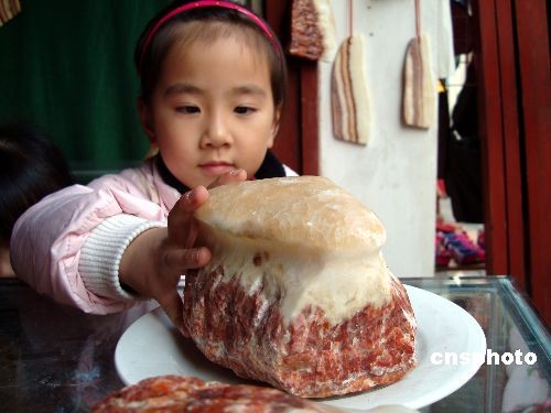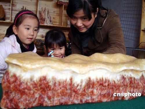 12月13日,在江蘇蘇州古鎮(zhèn)同里一家奇石店內一種酷似豬肉的天然石頭吸引了眾多游客。據悉,這些“豬肉石”是在地質運動過程中與其他礦物質接觸色化而成,不但長有“肉皮”,而且“瘦肉”和“肥肉”之分,呈現出多層次,十分逼真。中新社發(fā) 王建康 攝