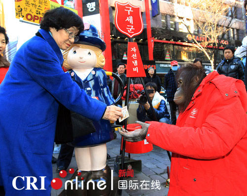 2008年12月15日,一只來自韓國高陽一家動物園的猩猩當(dāng)日現(xiàn)身首爾明洞街頭,為慈善組織“救世軍”募捐!熬仁儡姟北驹鲁蹰_始在韓國各大城市街頭接受社會捐贈。