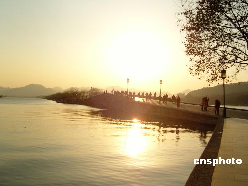 2009年1月1日,杭州西湖美景如畫(huà),美麗的西湖被染成了金黃色,也吸引了眾多游人駐足。中新社發(fā) 王磊 攝