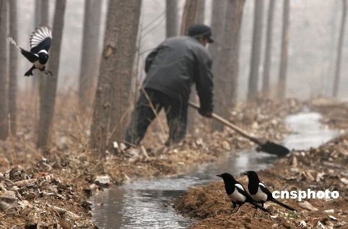 2月6日,河南洛陽嵩田湖鎮(zhèn)農(nóng)民引來嵩伊渠水流灌溉干旱的油菜地,一些喜鵲也趁機(jī)追逐水流,嬉戲解渴。中新社發(fā) 張曉理 攝