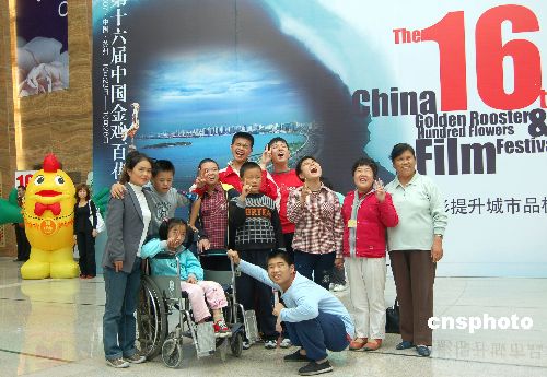 10月26日,蘇州市平江區(qū)培智學(xué)校組織近百名殘疾兒童到蘇州“鳥巢”——科技文化中心,感受正在舉行的第十六屆中國金雞百花電影節(jié)。圖為殘疾兒童在老師的陪同下高興地在電影節(jié)吉祥物前合影留念。中新社發(fā) 邱勇 攝