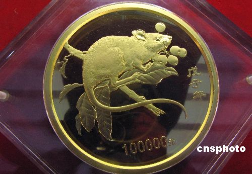 10月26日,由中國金幣總公司等單位主辦的“2007北京國際錢幣博覽會”在北京中國國際貿(mào)易中心開幕。博覽會展出了中國人民銀行于2007年10月23日發(fā)行的2008中國戊子(鼠)年金銀紀念幣一套。其中10公斤(鼠)圓形金質(zhì)紀念幣,含純金10公斤,直徑180毫米,面額100000元,成色99.9%,最大發(fā)行量僅僅18枚。據(jù)介紹,這枚10公斤金幣售價遠遠高于面值。中新社發(fā) 鄒憲 攝