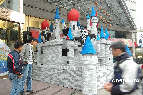 10月30日,兩座“鬼堡”出現(xiàn)在杭州一商店廣場。隨著“萬圣節(jié)”到來,杭州部分商家用各種形式的“鬼節(jié)”造型吸引顧客,抓住商機(jī)賺錢。中新社發(fā) 引煒 攝