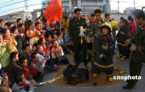 11月5日,小學生在消防戰(zhàn)士的幫助下試穿消防服,零距離接觸消防裝備。當日,山東省棗莊市臺兒莊區(qū)消防大隊舉辦“消防開放日”活動,1000余名中小學生走進消防大隊與消防裝備零距離接觸,消防隊員還將對中小學生進行消防演示、講解消防法規(guī)、消防常識及火災撲救方法等消防安全知識。中新社發(fā) 高啟民 攝