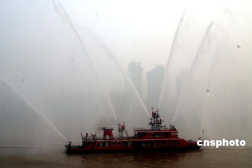 11月8日,重慶市水警總隊和重慶市水上消防支隊聯(lián)合舉辦“生命至上、平安和諧”大型消防安全宣傳活動,旨在進一步喚起當?shù)孛癖妳⑴c消防工作的熱情,增強民眾對消防工作的參與度。圖為重慶水上消防戰(zhàn)斗艇進行射水表演。中新社發(fā) 郭晉嘉 攝