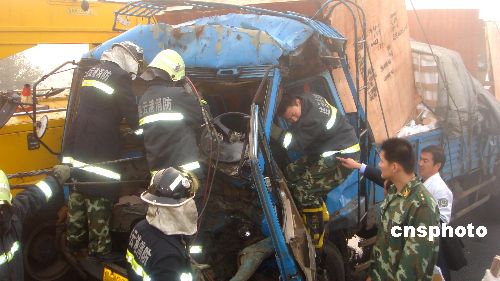 11月8日7時27分許,由于大霧,汾灌高速連云港浦南段發(fā)生三輛大貨車追尾相撞事故,造成二死二傷,傷者被成功救出后,已送往醫(yī)院搶救。中新社發(fā) 王春 攝