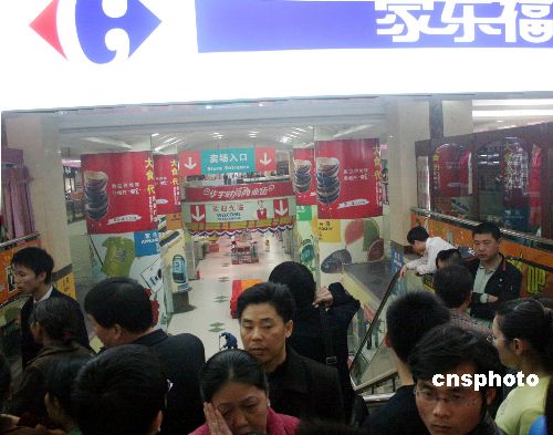 11月10日上午8時(shí)20分左右,重慶沙坪壩區(qū)家樂(lè)福商場(chǎng)內(nèi),發(fā)生一起因爭(zhēng)搶特價(jià)食用油造成的踩踏傷亡事故。目前已致3人死亡31人受傷,其中7人傷勢(shì)嚴(yán)重。圖為事故發(fā)生后,該超市隨即暫停營(yíng)業(yè),超市門(mén)口聚集大批當(dāng)?shù)厥忻瘛V行律绨l(fā) 郭晉嘉 攝