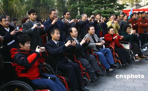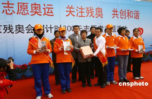 11月11日,主題為“微笑北京、志愿奧運、關注殘奧、共創(chuàng)和諧”的2008北京殘奧會倒計時300天志愿者主題活動,在北京東四奧林匹克社區(qū)公園舉行,《北京殘奧會志愿者培訓教材》中文版和盲文版首發(fā),同時為第二批奧運會、殘奧會志愿者培訓基地授牌。中新社發(fā) 杜洋 攝