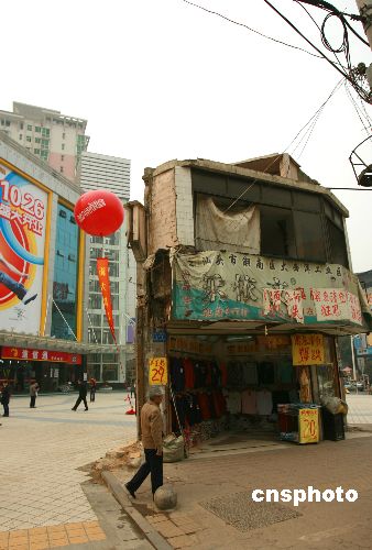 11月13日,在長沙人流如潮的黃金地段南門口,一家商廈廣場上挺立著一座陳舊的房子。據了解,從2005年項目啟動拆遷到現在,這個“釘子戶”已經堅持了近三年。中新社發(fā) 趙晶 攝