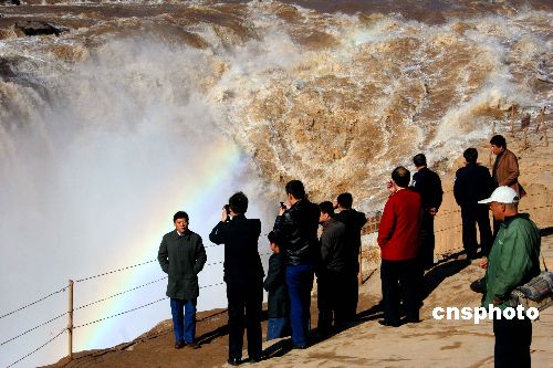 11月20日,氣勢磅礴的黃河壺口瀑布加上蔚藍的天空和一道金色的彩虹,把黃河壺口瀑布裝扮的格外漂亮,許多游人紛紛趕來欣賞這難得的景觀。中新社發(fā) 張旦 攝