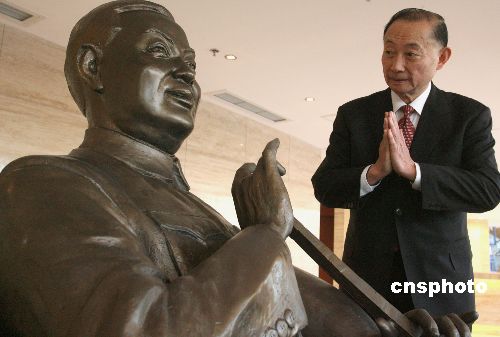十一月二十三日,坐落在梅蘭芳大劇院內(nèi)大廳中央的梅蘭芳銅像正式亮相,梅蘭芳之子梅葆玖在銅像揭幕儀式上流露出對父親的深情。中新社發(fā) 張勤 攝