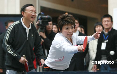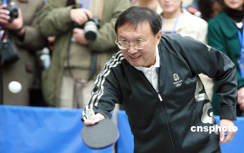 十一月二十五日,中國外交部在北京舉行主題為“中國外交與北京奧運(yùn)”的公眾開放日活動(dòng)。圖為外交部長(zhǎng)楊潔篪在“趣味乒乓賽”上一展身手。中新社發(fā) 廖文靜 攝