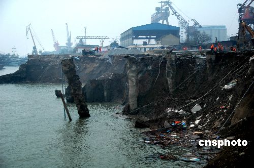 12月2日上午拍攝的坍塌現(xiàn)場(chǎng)圖片。12月1日晚,安徽省蕪湖市江東船廠岸邊,長(zhǎng)約90米7000多平方米的江堤突然坍塌,江東船廠10多間倉庫、一輛吊車及停在岸邊的一條躉船沉入水中。躉船上兩位值班的老人被一停留在岸邊的采砂船救起,事故造成近千萬元損失。目前,坍方現(xiàn)場(chǎng)得到控制。中新社發(fā) 老春 攝