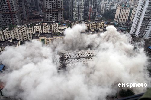 12月6日15時,隨著一聲爆破聲起,位于重慶市主城鬧市的一棟25層、78米高的爛尾樓轟然倒下。該樓是中國西南地區(qū)到目前為止爆破拆除的最高大樓,也是重慶用爆破方式拆除的最大一座爛尾樓。中新社發(fā) 郭晉嘉 攝