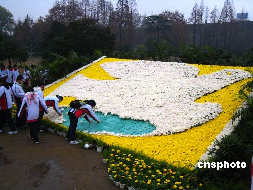 2007年12月13日是“南京大屠殺”70周年紀念日。12月12日,南京人民為寄托對南京大屠殺遇難同胞的衷思,他們用菊花在南京玄武湖環(huán)湖路明鏡廣場組成一只巨型和平鴿!昂推进潯泵娣e達70平方米,象征南京大屠殺遇難同胞70周年忌日;用25550支菊花,寄托著70周年的25550天對遇難同胞的哀思;振翅起飛的和平鴿,寓意中國人民向往和平的美好心愿。圖為一群學生在用菊花拼和平鴿。中新社發(fā) 谷昌旺 攝