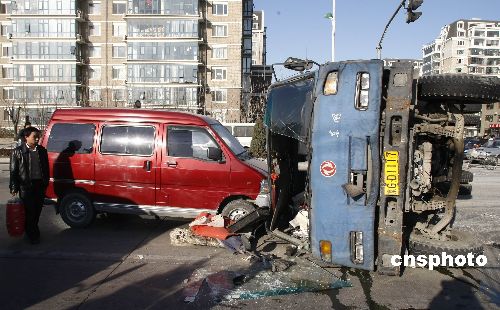 十二月十五日,北京天通苑小區(qū)門(mén)前道路,一輛拉載水泥板的大型貨車(chē)在路口拐彎時(shí)側(cè)翻,造成交通堵塞。中新社發(fā) 廖文靜 攝