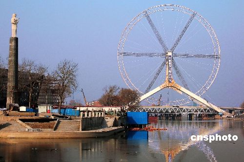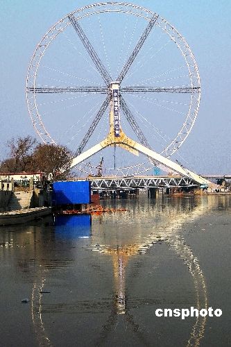 12月18日,位于天津三岔河口的重要景觀工程——“天津之眼”摩天輪輪盤(pán)安裝完畢,轉(zhuǎn)入負(fù)重測(cè)試和摩天輪座艙、電力驅(qū)動(dòng)裝置安裝階段。“天津之眼” 摩天輪直徑110米,其最高點(diǎn)距離地面約120米。輪盤(pán)外掛48個(gè)透明座艙,可供384人同時(shí)觀光,是名副其實(shí)的“天津之眼”。 中新社發(fā) 田齊 攝