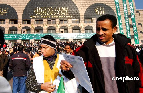 12月19日上午,在浙江義烏經(jīng)商的阿拉伯國家和國內(nèi)新疆、寧夏等地的7000余名穆斯林商人,聚集在市區(qū)江濱西路清真寺內(nèi)參加會禮,歡度穆斯林的傳統(tǒng)節(jié)日——古爾邦節(jié)。近年來,巴基斯坦、阿聯(lián)酋、埃及、也門、沙特、科威特、伊朗、阿富汗、約旦、毛里塔尼亞等40個國家的5000多名穆斯林商人到義烏市場常駐采購。為尊重國外商人的宗教信仰,該市專門建造了一座能容納4000多人的伊斯蘭教活動場所——清真大寺。中新社發(fā) 張建成 攝