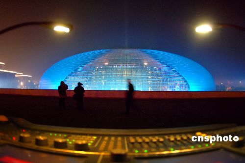 12月20日,北京國(guó)家大劇院測(cè)試首個(gè)演出季的外部燈光效果,藍(lán)色的燈光和背后高功率射燈將國(guó)家大劇院裝扮得夢(mèng)幻迷人。據(jù)悉,本次開(kāi)幕國(guó)際演出季將從2007年12月22日持續(xù)到2008年4月6日,期間將有78個(gè)劇目、180場(chǎng)精彩演出在這里隆重上演,其中三分之一為國(guó)外劇目,涵蓋了歌劇、舞劇、音樂(lè)會(huì)、話劇、民族戲曲五大藝術(shù)門(mén)類,預(yù)計(jì)接納觀眾30萬(wàn)人次。中新社發(fā) 廖攀 攝
