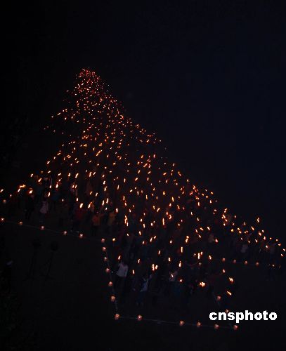 12月24日晚,2000名游客在長(zhǎng)沙世界之窗高舉手中的火把,擺出圣誕樹(shù)隊(duì)形。據(jù)悉,如此巨型的“人體”圣誕樹(shù)在中國(guó)來(lái)說(shuō)尚屬首創(chuàng)。中新社發(fā) 肖前輝 攝