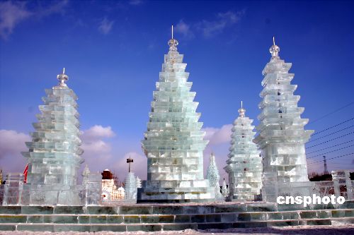 2007年12月31日,沈陽棋盤山冰雪大世界云南大理三塔等大型冰雕及雪雕已現(xiàn)雛形。1月8日,2008沈陽國際冰雪節(jié)將開幕。中新社發(fā) 劉寶成 攝