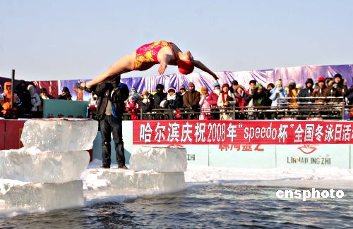 2008年元旦,哈爾濱江上運(yùn)動中心500多國內(nèi)外游客在觀看冬泳表演。當(dāng)天200多名哈爾濱冬泳健兒在松花江職工冬泳場,以冬泳表演的方式歡度元旦。中新社發(fā) 姚庭山 攝