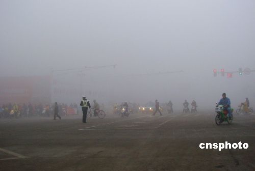 2008年1月7日,江蘇連云港遭遇大霧天氣,能見(jiàn)度不足50米,市民們謹(jǐn)慎出行!叭拧鼻跋ΓB云港最高溫度達(dá)到12℃,一直保持升高回暖的態(tài)勢(shì),極易形成大霧天氣。中新社發(fā) 耿玉和 攝