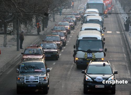 一月七日,新疆烏魯木齊,三千余輛出租車自發(fā)組成車隊浩浩蕩蕩為烈士送行。當日,在撲滅“1.2”烏魯木齊德匯國際廣場大火中犧牲的三位消防官兵追悼會在該市殯儀館舉行,新疆各界人士及三千余輛出租車、萬余市民自發(fā)為三位烈士送別。中國公安部已批準壯烈犧牲的烏魯木齊消防支隊官兵朱曉雷、張宇、高峰三人為“革命烈士”。中新社發(fā) 劉新 攝