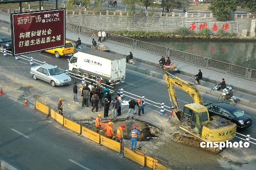 1月7日,杭州艮山運(yùn)河橋機(jī)動(dòng)車道橋面發(fā)生局部坍塌事故,坍塌形成的窟窿直徑約5米,深約2米,面積達(dá)30多平方米,所幸沒有造成人員傷亡和車輛受損,但對交通造成較大影響,具體原因尚待有關(guān)部門調(diào)查。據(jù)了解,艮山運(yùn)河橋始建于1988年,由于交通流量較大,曾多次進(jìn)行過比較全面的修繕和拓寬,該橋曾發(fā)生過橋面人行道突然坍塌導(dǎo)致行人墜落的事故。中新社發(fā) 引煒 攝