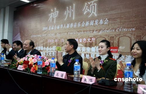 1月8日,“神州頌2008·首屆全球華人新春音樂會”新聞發(fā)布會在北京舉行。由中央電視臺、中國唱片總公司、重慶力帆集團共同打造的“神州頌2008·首屆全球華人新春音樂會”,將于1月15日在奧地利維也納金色大廳拉開帷幕,國際著名指揮家邵恩擔任指揮。在世界音樂之都的神圣殿堂,“神州頌2008·首屆全球華人新春音樂會”的舉行將是一場極富東方魅力的視聽盛宴。中新社發(fā) 張勤 攝