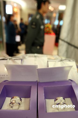 一月十一日,“相印五環(huán) 百年華嫁”奧運(yùn)特許商品結(jié)婚鉆飾新品在北京上市。這是第一款?yuàn)W運(yùn)婚慶主題概念的鉆石類奧運(yùn)特許商品,突破了貴金屬特許商品市場(chǎng)只有收藏性紀(jì)念品的局限,創(chuàng)新性填補(bǔ)了市場(chǎng)空白。中新社發(fā) 任海霞 攝