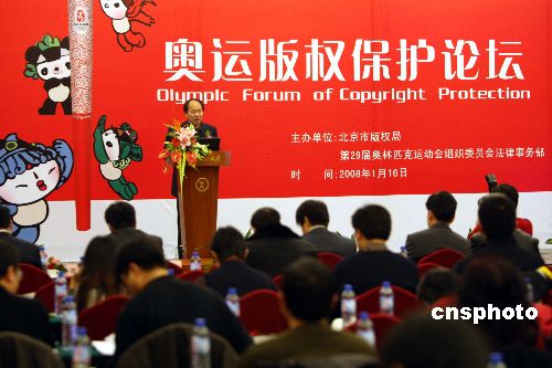 一月十六日,由北京市版權(quán)局、北京奧組委共同組織的“奧運版權(quán)保護(hù)論壇”在北京舉行。這是新年伊始,由政府管理部門組織的第一個以奧運版權(quán)保護(hù)為主題的大型宣傳活動。中新社發(fā) 任海霞 攝