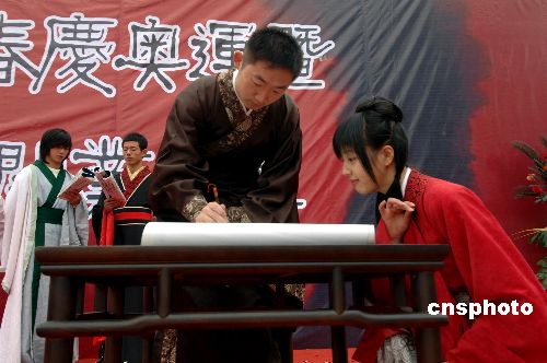 一月十八日,福州漢服愛好者正在表演情景劇。當(dāng)日,福州漢唐文化藝術(shù)中心隆重開業(yè),熱衷追逐古典文化的福州漢服天下工作人員上臺(tái)表演助興。中新社發(fā) 王東明 攝