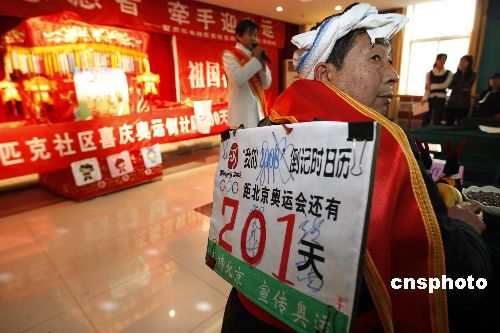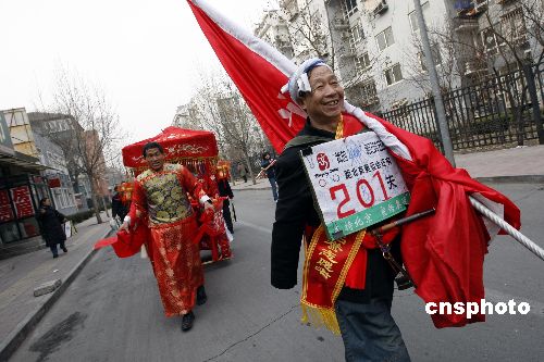 1月20日,山西“驢驢人”倪育生和來(lái)自山東的大花轎一起闖進(jìn)了北京東四奧林匹克社區(qū),為迎接北京奧運(yùn)會(huì)倒計(jì)時(shí)200天做宣傳。當(dāng)日,來(lái)自全國(guó)7省市的民間奧運(yùn)宣傳志愿者齊聚北京,相互交流奧運(yùn)宣傳經(jīng)驗(yàn)。中新社發(fā) 杜洋 攝