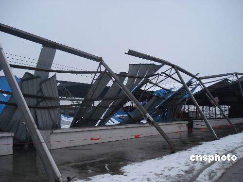 2008年1月20日凌晨,由于連日的暴雪,導致安徽省合肥市包河苑農貿市場上千平方米蔬菜大棚被雪壓塌。由于連降暴雪,安徽合肥等地,不少工廠倉庫和農貿市場的簡易大棚被雪壓塌,目前沒有造成人員傷亡。中新社發(fā) 何保豐 攝