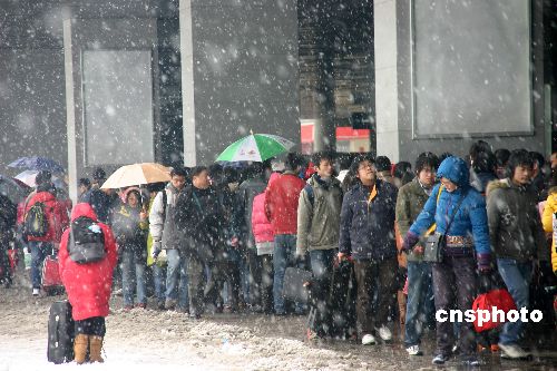 2008年1月26日,南京出現(xiàn)入冬以來最大幅度的降溫和雨雪天氣,受通往外地的高速公路全部關閉的影響,南京火車站迎來春運以來的最大客流量,前來購票的旅客一直排到站外廣場,交警和武警官兵也協(xié)助車站方面維護秩序。中新社發(fā) 阿董 攝
