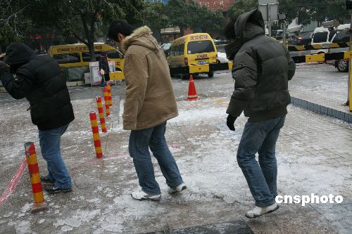 圖為三名青年小心翼翼地在街頭厚厚冰層上行走。
