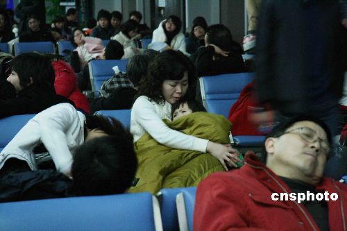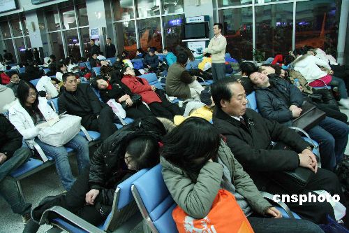 1月27日消息,1月13日以來,湖南省遭遇1954年以來,50年不遇的、持續(xù)時間最長、氣溫最低的冰凍天氣,長沙機場受冰雪天氣影響,飛機跑道結冰,導致大面積航班取消或延誤,25日當晚19點15分機場開始關閉,場內(nèi)2000多名已辦登機手續(xù)或途經(jīng)此中轉的返鄉(xiāng)乘客滯留在候機廳內(nèi)。中新社發(fā) 蘇巧帥 攝
