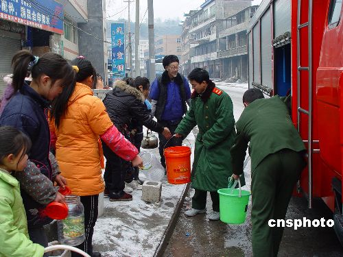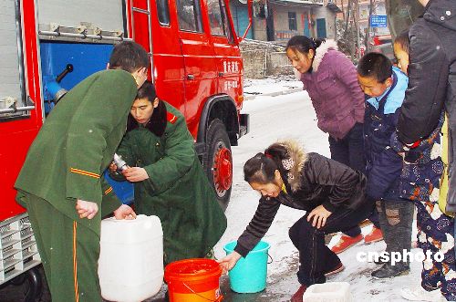 1月28日,重慶黔江消防官兵為自來(lái)水中斷近一周的交通西路居民送水到戶。連日來(lái),重慶市近10個(gè)區(qū)縣普降大雪,部分地區(qū)積雪最深度甚至超過(guò)20厘米,由于大雪覆蓋,天氣寒冷,一時(shí)間,黔江、武隆、酉陽(yáng)、彭水等區(qū)縣均出現(xiàn)公路結(jié)冰、電力中斷、市民飲水困難情況,對(duì)群眾生活造成極大困繞。中新社發(fā) 王松 攝