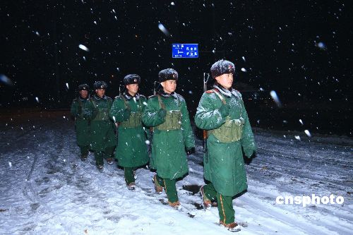 2008年1月28日,武警戰(zhàn)士雪夜中巡邏在武漢長(zhǎng)江大橋上。擔(dān)負(fù)武漢市長(zhǎng)江大橋守衛(wèi)任務(wù)的武警武漢市支隊(duì)官兵,在武漢市連續(xù)多日暴雪天氣里,不畏風(fēng)雪,認(rèn)真守衛(wèi)著長(zhǎng)江大橋,確保京廣鐵路和過(guò)江車輛暢通無(wú)阻。中新社發(fā) 宋建春 攝