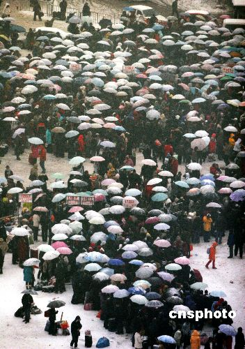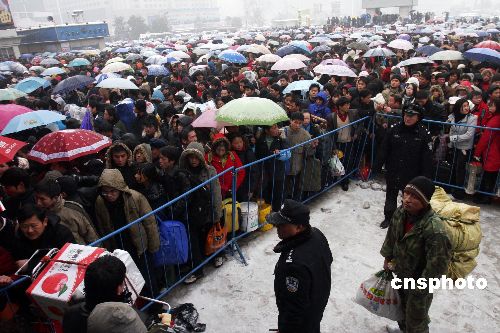 1月28日,漢口火車站廣場上客流爆滿,檢票進站口乘客們在雪中艱難前移。武漢市連日來的強降雪給交通帶來極大不便,火車站因列車晚點、停發(fā),滯留了大量的旅客。中新社發(fā) 攝記 攝