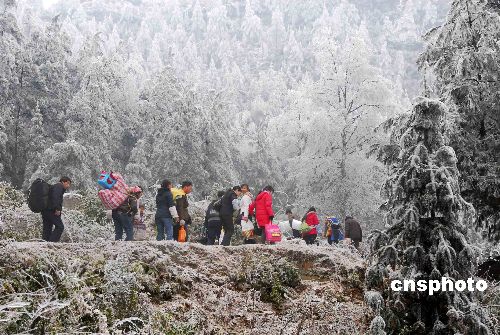 2008年1月31日,在貴陽市海拔二千多米的高坡鄉(xiāng),公路上凝凍有1.5公分厚。許許多多在外打工的農(nóng)民工肩上擔(dān)著過年貨,腳下綁扎著稻草,使用各種方法趕路回家。中新社發(fā) 張?zhí)炝?攝