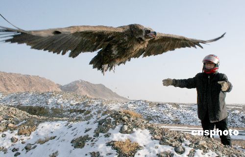 2008年2月2日,新疆哈密地區(qū)野生動植物保護辦公室的一名工作人員在放飛禿鷲。07年12月初,新疆哈密的一名民工將一只受重傷國家二級保護動物禿鷲送到新疆哈密地區(qū)野生動植物保護辦公室進行救治。2月2日,完全恢復健康的禿鷲被放歸大自然。 據(jù)介紹, 禿鷲又名座山雕、狗頭鷲,分布在我國的新疆、青海、甘肅、寧夏、內(nèi)蒙古等地。它們屬于大型猛禽。全長約110厘米。身體的羽毛主要呈黑褐色。主要以鳥獸的尸體和其他腐爛動物為食。中新社發(fā) 普拉提 攝
