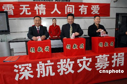 深圳航空公司二月四日發(fā)出緊急倡議,掀起“冰雪無情,人間有愛”賑災(zāi)捐款活動(dòng)。當(dāng)日下午,僅半小時(shí)首批員工捐款已達(dá)二十余萬元人民幣。深航總裁李昆表示,我們的愛心行動(dòng)將繼續(xù)開展下去,善款立即定向電匯貴州遵義、安順災(zāi)區(qū)。中新社發(fā) 陳文 攝