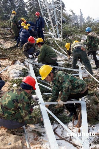 一座塔倒下去,又一座塔立起來,湖南望城縣橋驛鎮(zhèn)月塘村華沙線500千伏塔,電力工人羅海文、羅長明、周景華不幸遇難的送變電倒塌電塔現(xiàn)場,經(jīng)過湖南省送變電建設(shè)有限公司三分公司140多職工和120名武警官兵日夜搶修,2月3日,在原41號鐵塔的廢墟上立起了一座新塔。另外44、43號倒塌的鐵塔也在近日修復。中新社發(fā) 殷中民 攝