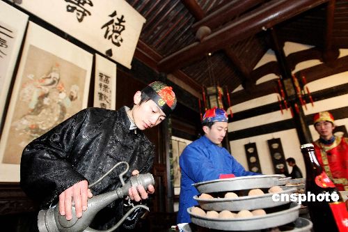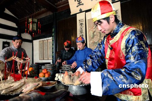 2月8日,紹興魯迅故里舉行“祝福”祭祀活動。當(dāng)日是農(nóng)歷正月初二,浙江紹興魯迅故里在周家老臺門模仿魯迅小說《祝!返膱鼍,從正月初一至初五每天進(jìn)行紹興傳統(tǒng)年俗“祝!眻鼍氨硌。紹興的年俗“祝!币螋斞感≌f而名揚天下,浙江省將紹興魯迅故里“祝福”定為惟一的春節(jié)保護(hù)示范地。中新社發(fā) 袁云 攝