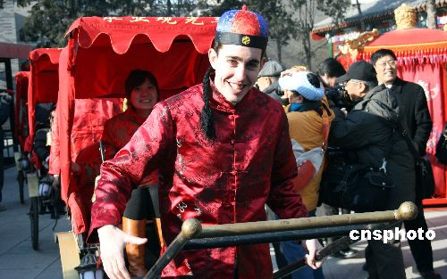 2月8日,農(nóng)歷正月初二,是天津女婿給岳父母大人拜年的特定日子,天津人稱之為“姑爺節(jié)”。圖為“洋”姑爺在天津古文化街新春廟會上參加姑爺節(jié)活動。中新社發(fā) 吳迪 攝