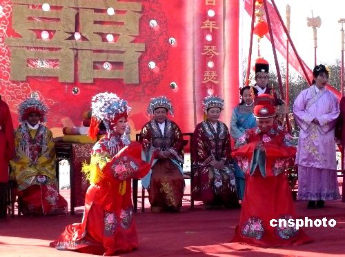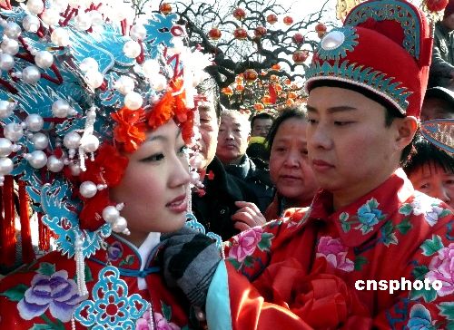 2月8日,由北京大觀園主辦的2008年紅樓廟會(huì)吸引眾多游客,在廟會(huì)傳統(tǒng)的“元妃省親”古裝游行的盛大場(chǎng)景中,大觀園為《紅樓夢(mèng)》一書中未能成婚的賈寶玉、林黛玉專門舉行一場(chǎng)別開生面的“寶黛成婚”場(chǎng)面,令游客耳目一新。中新社發(fā) 錢興強(qiáng) 攝